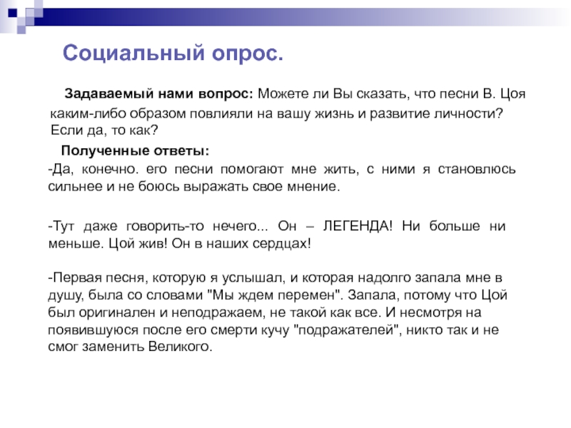 -Тут даже говорить-то нечего... Он – ЛЕГЕНДА! Ни больше ни меньше. Цой жив! Он в наших сердцах!