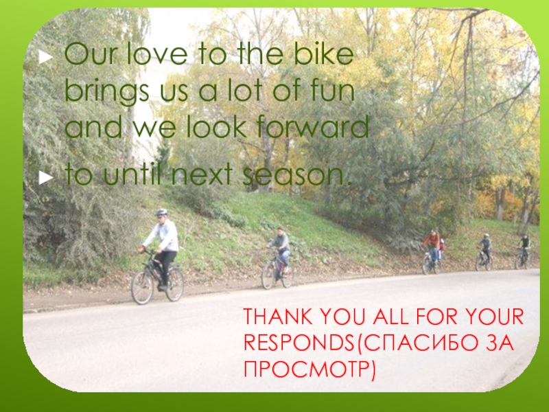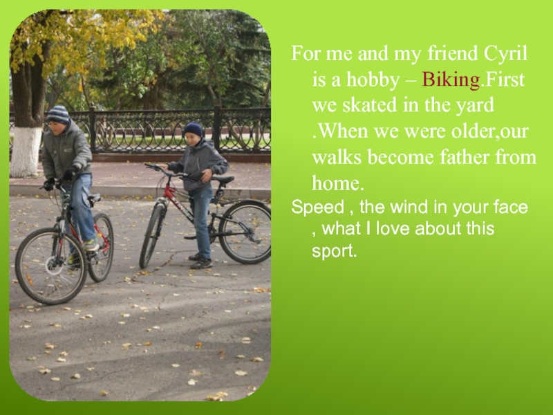 For me and my friend Cyril is a hobby – Biking.First we skated in the yard .When we were older,our walks become father from home.