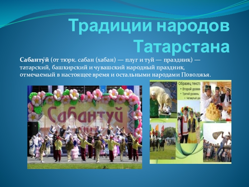 Традиции народов ТатарстанаСабанту́й (от тюрк. сабан (хабан) — плуг и туй — праздник) — татарский, башкирский и чувашский