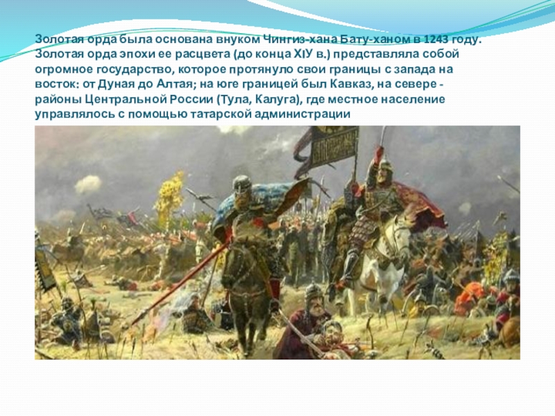 Золотая орда была основана внуком Чингиз-хана Бату-ханом в 1243 году. Золотая орда эпохи ее расцвета (до конца