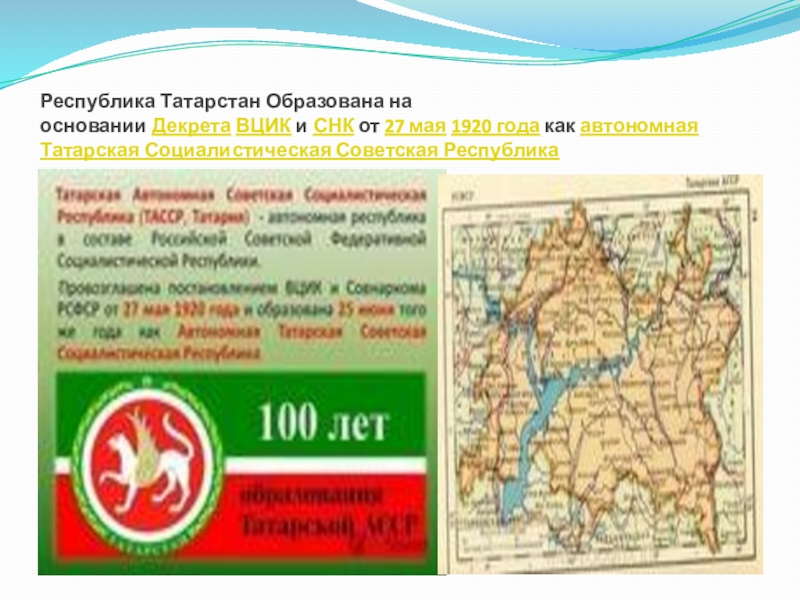Республика Татарстан Образована на основании Декрета ВЦИК и СНК от 27 мая 1920 года как автономная Татарская Социалистическая Советская Республика