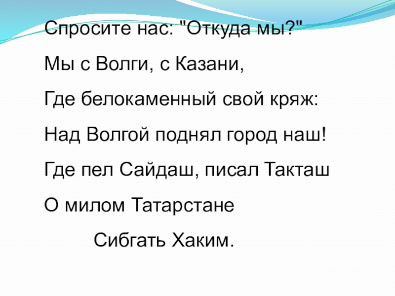 Слайд 11Спросите нас: "Откуда мы?" Мы с Волги, с Казани, Где белокаменный свой кряж: Над