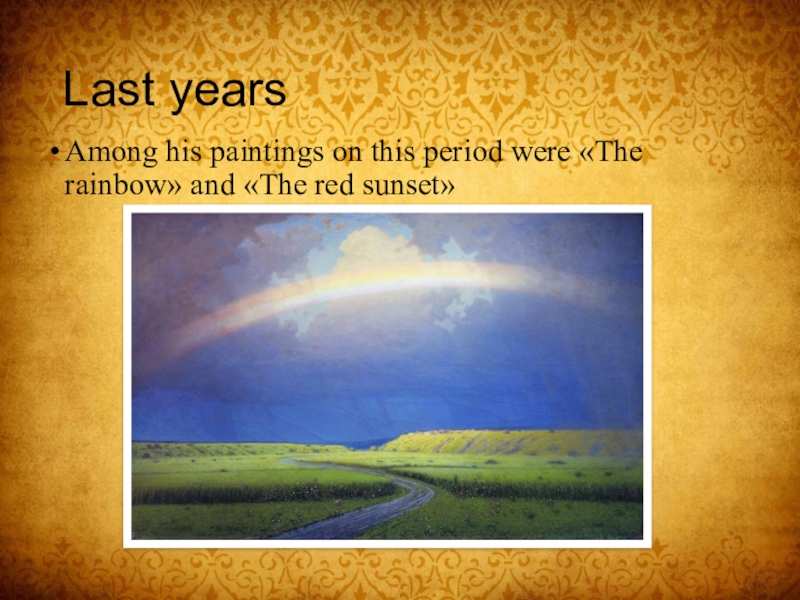In 1865 he went to St.Petersburg and there made the picture named "The Tatar hut in the Crimea“. In 1868 it was presented at the academic exhibition. Thanks to this picture he got the title of a free artist.