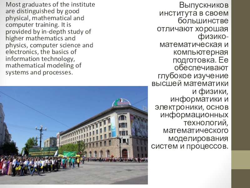 Выпускников института в своем большинстве отличают хорошая физико-математическая и компьютерная подготовка. Ее обеспечивают глубокое изучение высшей математики и физики, информатики и электроники, основ информационных технологий, математического моделирования систем и процессов.
