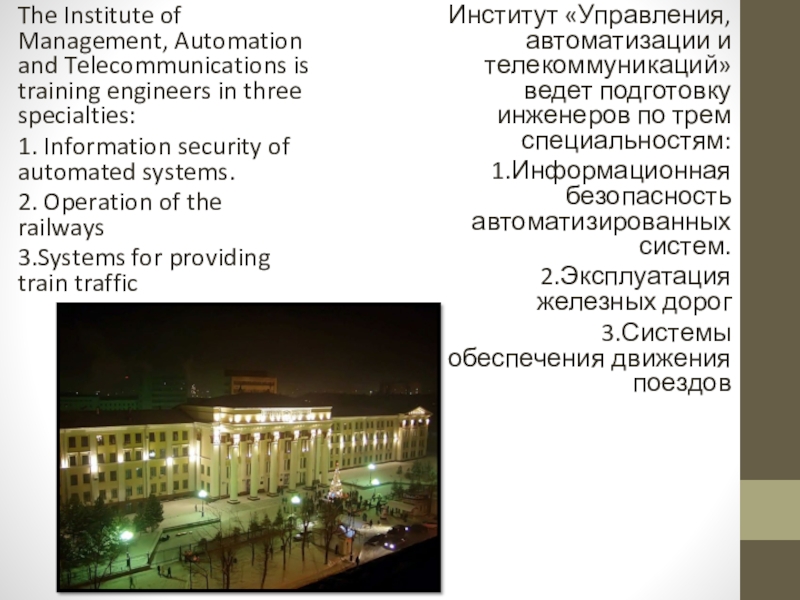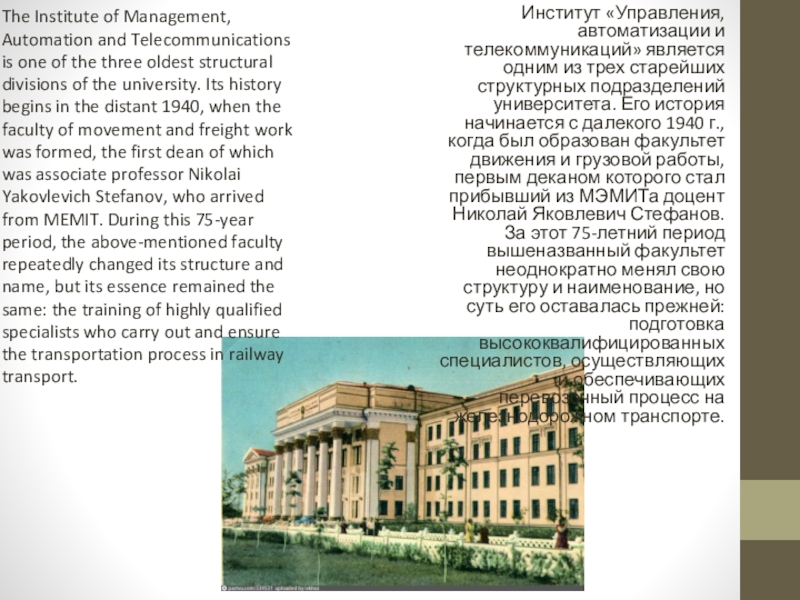 The Institute of Management, Automation and Telecommunications is one of the three oldest structural divisions of the university. Its history begins in the distant 1940, when the faculty of movement and freight work was formed, the first dean of which was associate professor Nikolai Yakovlevich Stefanov, who arrived from MEMIT. During this 75-year period, the above-mentioned faculty repeatedly changed its structure and name, but its essence remained the same: the training of highly qualified specialists who carry out and ensure the transportation process in railway transport.