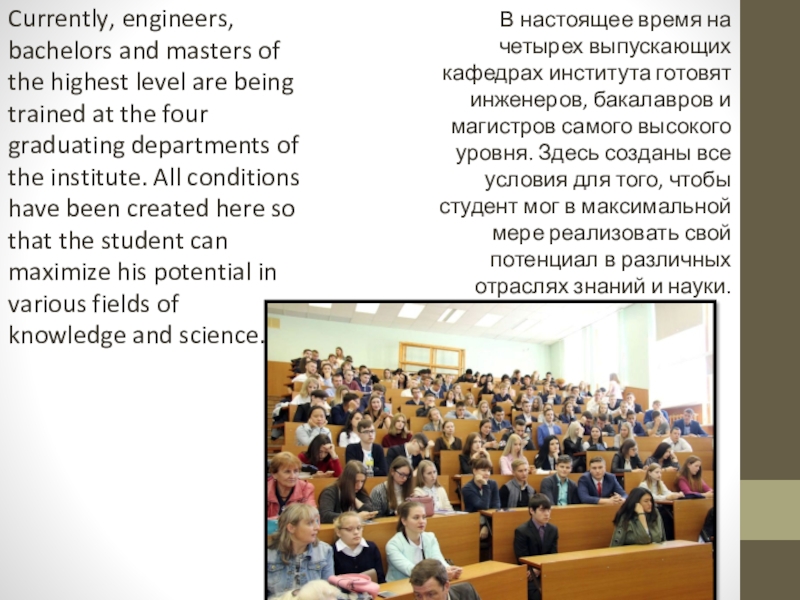 В настоящее время на четырех выпускающих кафедрах института готовят инженеров, бакалавров и магистров самого высокого уровня. Здесь созданы все условия для того, чтобы студент мог в максимальной мере реализовать свой потенциал в различных отраслях знаний и науки.