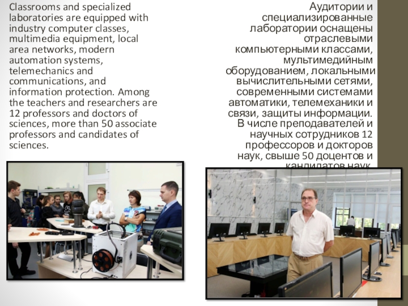 Аудитории и специализированные лаборатории оснащены отраслевыми компьютерными классами, мультимедийным оборудованием, локальными вычислительными сетями, современными системами автоматики, телемеханики и связи, защиты информации. В числе преподавателей и научных сотрудников 12 профессоров и докторов наук, свыше 50 доцентов и кандидатов наук.