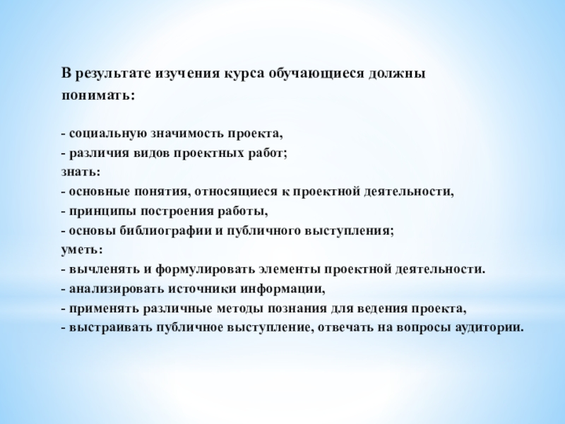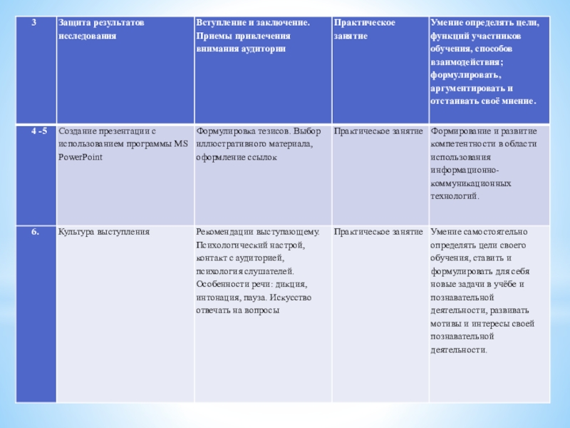 - выстраивать публичное выступление, отвечать на вопросы аудитории.