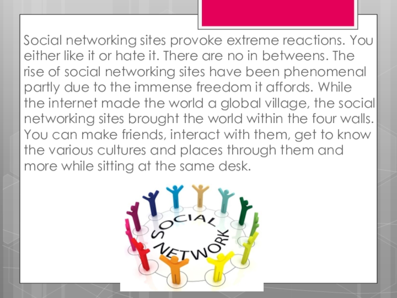 Слайд 2Social networking sites provoke extreme reactions. You either like it or