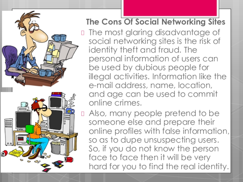 networking sites is the risk of identity theft and fraud. The personal information of users can be used by dubious people for illegal activities. Information like the e-mail address, name, location, and age can be used to commit online crimes.