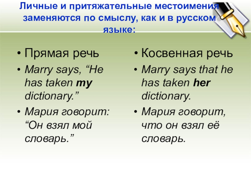 Мария говорит: “Он взял мой словарь.”