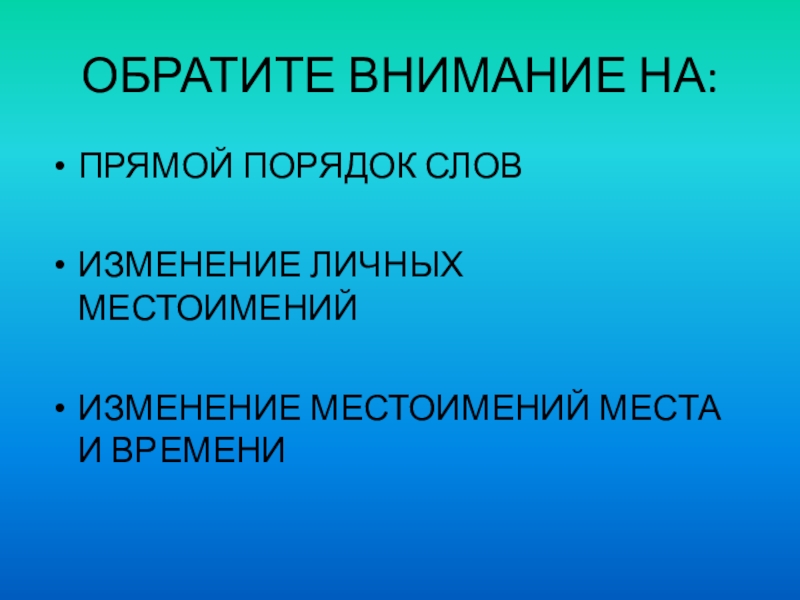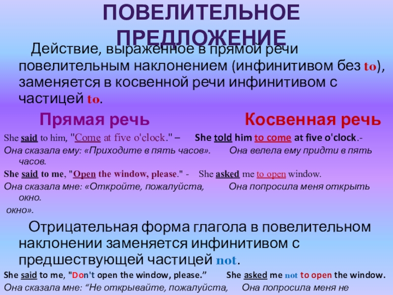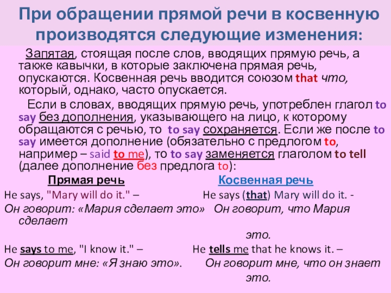 Если в словах, вводящих прямую речь, употреблен глагол to say без дополнения, указывающего на лицо, к которому обращаются с речью, то to say сохраняется. Если же после to say имеется дополнение (обязательно с предлогом to, например – said to me), то to say заменяется глаголом to tell (далее дополнение без предлога to):
