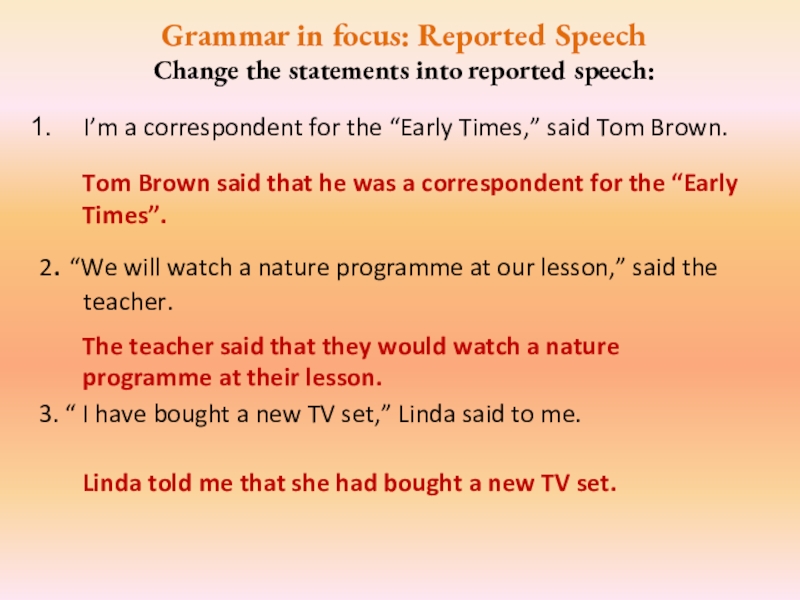 Запятая, стоящая после слов, вводящих прямую речь, а также кавычки, в которые заключена прямая речь, опускаются. Косвенная речь вводится союзом that что, который, однако, часто опускается.
