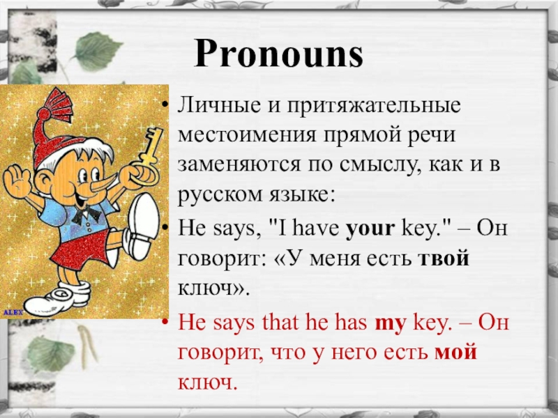 Личные и притяжательные местоимения прямой речи заменяются по смыслу, как и