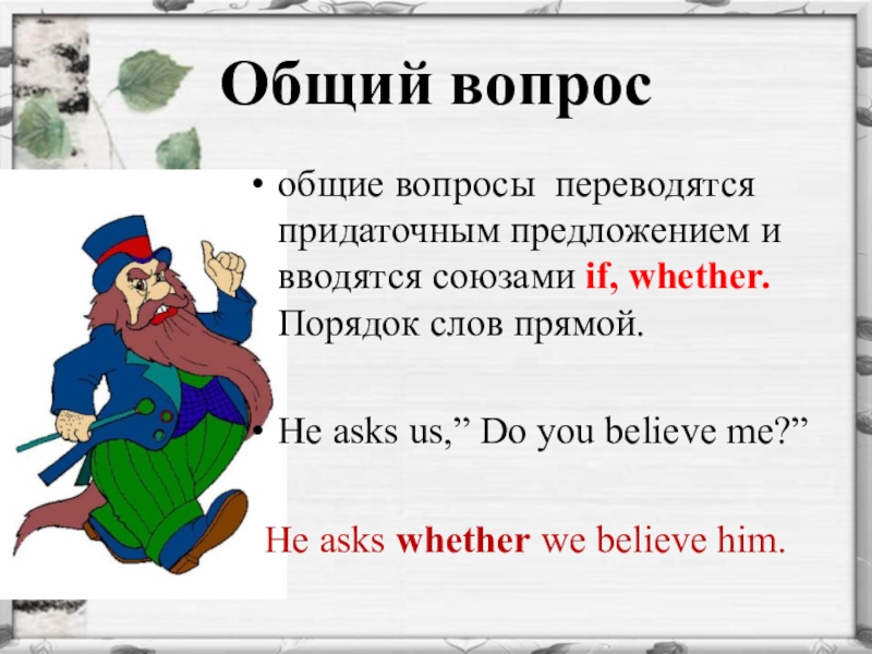 общие вопросы переводятся придаточным предложением и вводятся союзами if, whether.