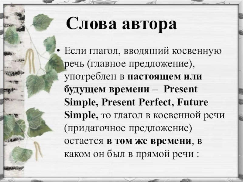 или будущем времени – Present Simple, Present Perfect, Future Simple, то глагол в косвенной речи (придаточное предложение) остается в том же времени, в каком он был в прямой речи :