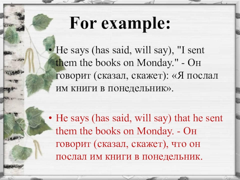 books on Monday." - Он говорит (сказал, скажет): «Я послал им книги в понедельник».