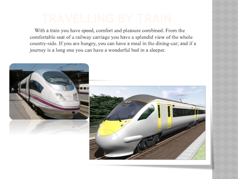 travelling by train	With a train you have speed, comfort and pleasure combined. From the comfortable seat of