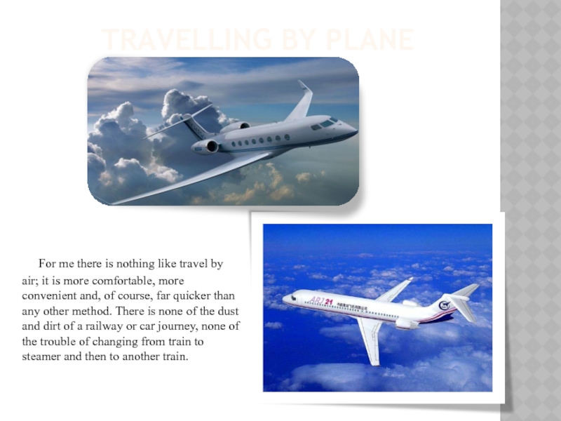 travelling by plane	 For me there is nothing like travel by air; it is more comfortable, more