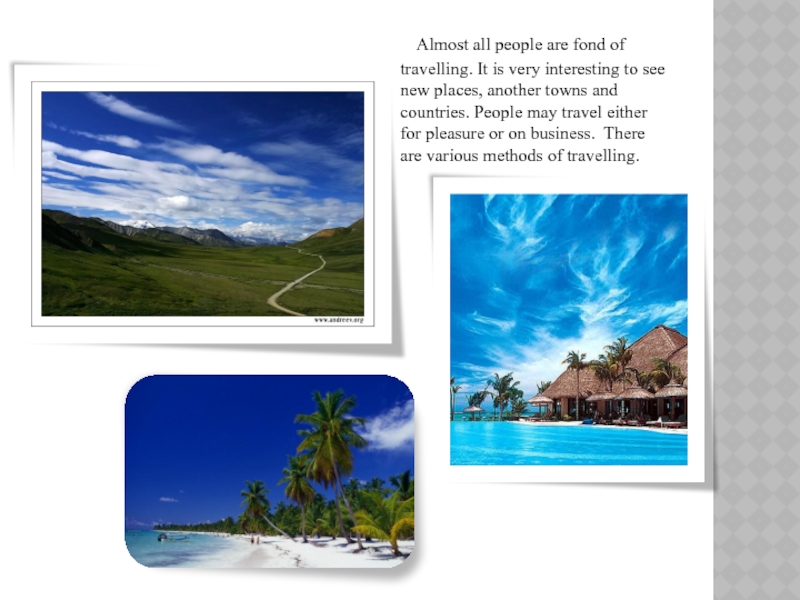 Almost all people are fond of travelling. It is very interesting to see new places, another towns and countries. People may travel either for pleasure or on business. There are various methods of travelling.