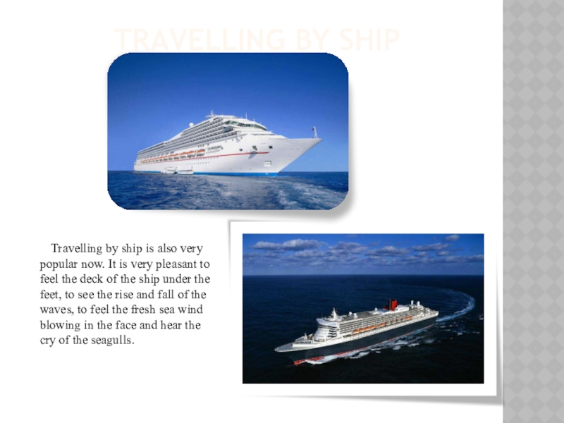 travelling by ship	Travelling by ship is also very popular now. It is very pleasant to feel the