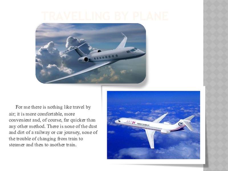 travelling by plane	 For me there is nothing like travel by air; it is more comfortable, more