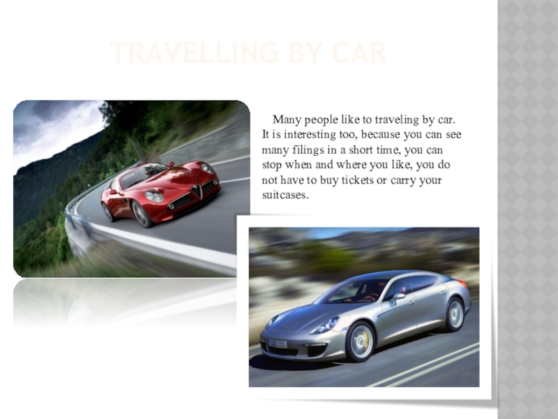 travelling by car	Many people like to traveling by car. It is interesting too, because you can see