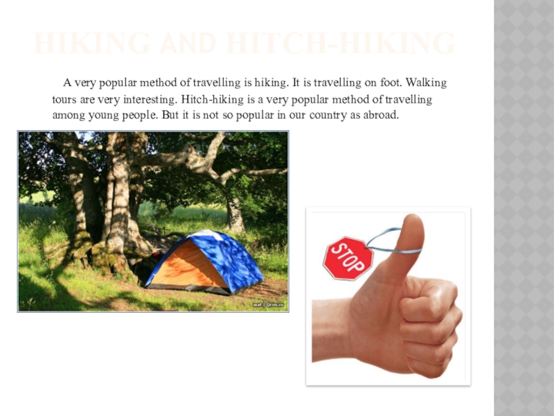 is travelling on foot. Walking tours are very interesting. Hitch-hiking is a very popular method of travelling among young people. But it is not so popular in our country as abroad.