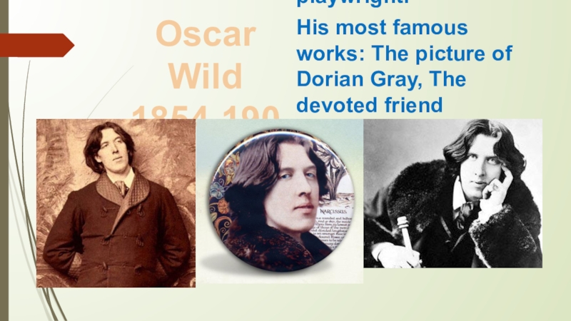 Oscar Wild 1854-1900Born in Dublin, Ireland. Mostly famous as a playwright. His most famous works: The picture