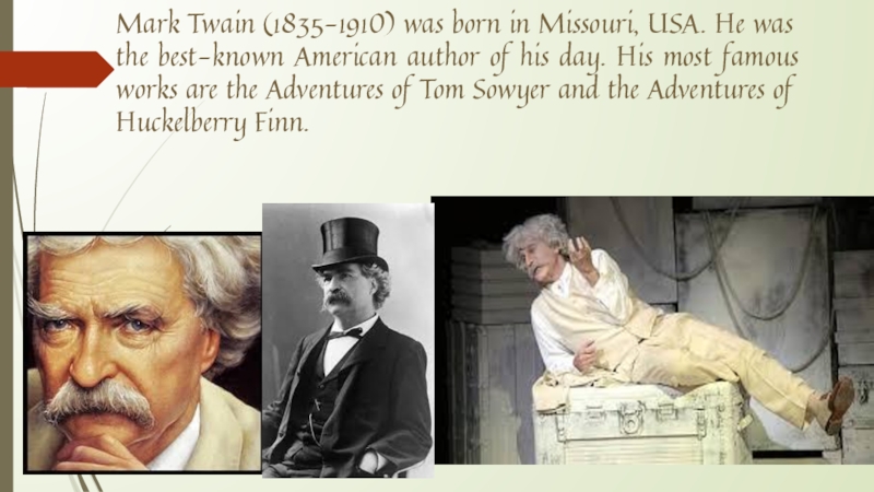 Слайд 5Mark Twain (1835-1910) was born in Missouri, USA. He was the