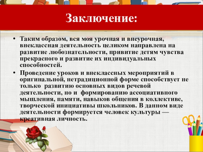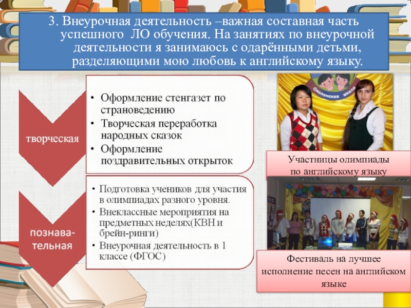 3. Внеурочная деятельность –важная составная часть успешного ЛО обучения. На занятиях по внеурочной деятельности я занимаюсь с одарёнными детьми, разделяющими мою любовь к английскому языку.
