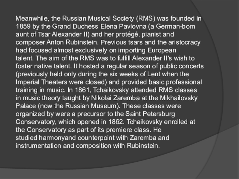 Слайд 4Meanwhile, the Russian Musical Society (RMS) was founded in 1859 by the Grand Duchess