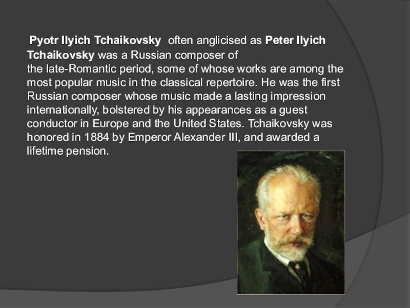Слайд 2 Pyotr Ilyich Tchaikovsky  often anglicised as Peter Ilyich Tchaikovsky was a Russian composer of the late-Romantic period, some