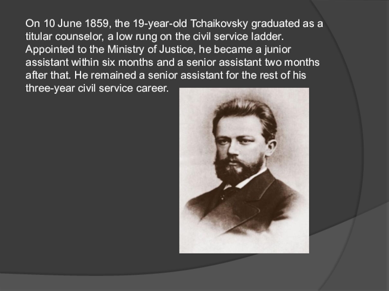 Слайд 3On 10 June 1859, the 19-year-old Tchaikovsky graduated as a titular