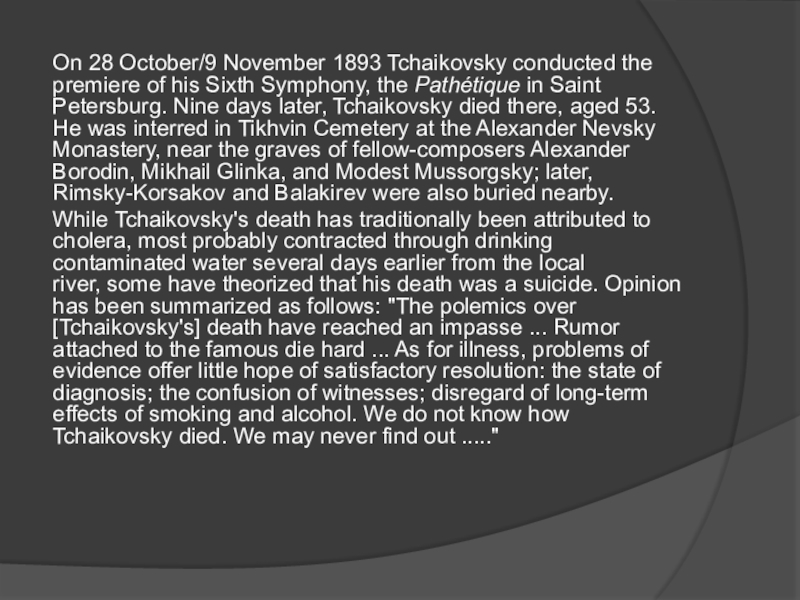 Слайд 6On 28 October/9 November 1893 Tchaikovsky conducted the premiere of his Sixth