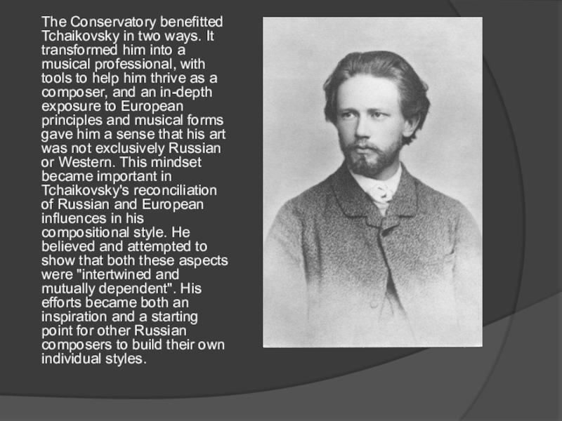 Слайд 5The Conservatory benefitted Tchaikovsky in two ways. It transformed him into