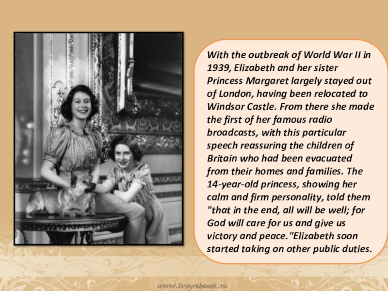 her sister Princess Margaret largely stayed out of London, having been relocated to Windsor Castle. From there she made the first of her famous radio broadcasts, with this particular speech reassuring the children of Britain who had been evacuated from their homes and families. The 14-year-old princess, showing her calm and firm personality, told them "that in the end, all will be well; for God will care for us and give us victory and peace."Elizabeth soon started taking on other public duties.