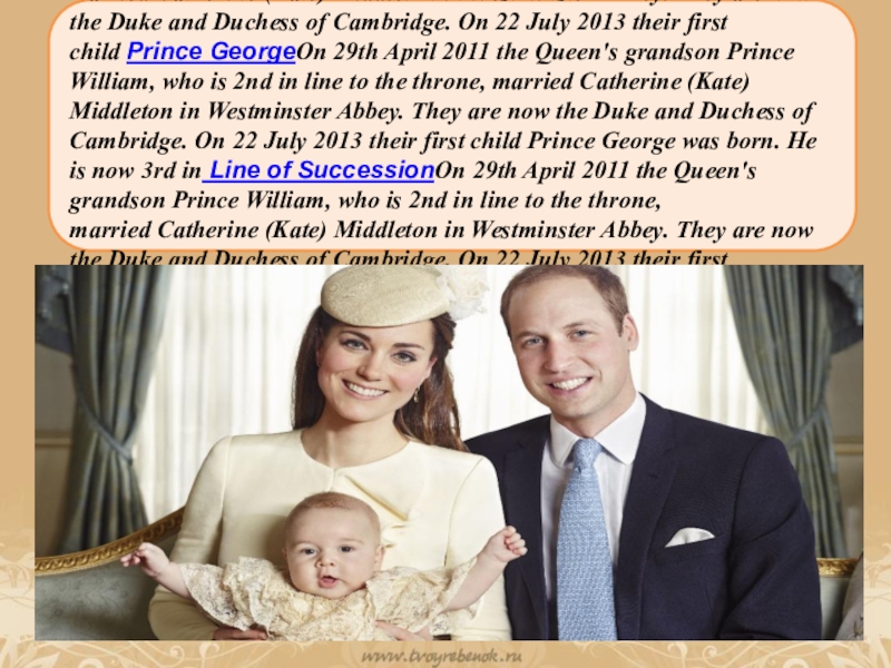 the Queen's grandson Prince William, who is 2nd in line to the throne, married Catherine (Kate) MiddletonOn 29th April 2011 the Queen's grandson Prince William, who is 2nd in line to the throne, married Catherine (Kate) Middleton in Westminster Abbey. They are now the Duke and Duchess of Cambridge. On 22 July 2013 their first child Prince GeorgeOn 29th April 2011 the Queen's grandson Prince William, who is 2nd in line to the throne, married Catherine (Kate) Middleton in Westminster Abbey. They are now the Duke and Duchess of Cambridge. On 22 July 2013 their first child Prince George was born. He is now 3rd in Line of SuccessionOn 29th April 2011 the Queen's grandson Prince William, who is 2nd in line to the throne, married Catherine (Kate) Middleton in Westminster Abbey. They are now the Duke and Duchess of Cambridge. On 22 July 2013 their first child Prince George was born. He is now 3rd in Line of Succession to the thone after his father, Prince William, and his grandfather Prince Charles.Their second child Princess Charlotte was born on 2nd May 2015 and is 4th in line.