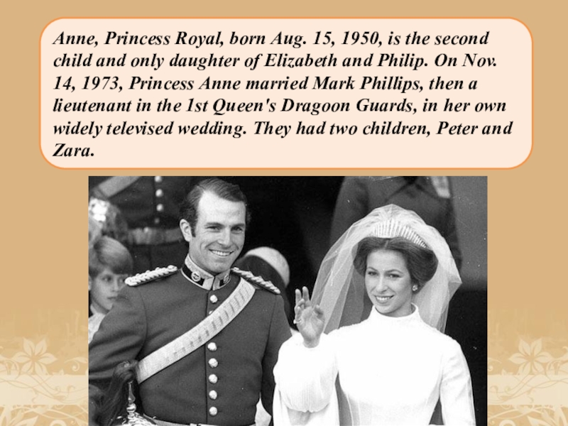 and only daughter of Elizabeth and Philip. On Nov. 14, 1973, Princess Anne married Mark Phillips, then a lieutenant in the 1st Queen's Dragoon Guards, in her own widely televised wedding. They had two children, Peter and Zara.