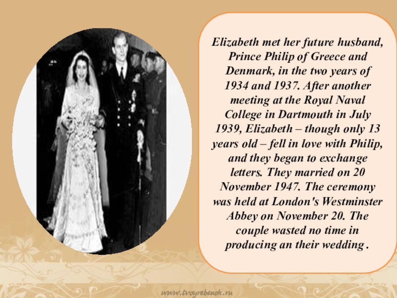 in the two years of 1934 and 1937. After another meeting at the Royal Naval College in Dartmouth in July 1939, Elizabeth – though only 13 years old – fell in love with Philip, and they began to exchange letters. They married on 20 November 1947. The ceremony was held at London's Westminster Abbey on November 20. The couple wasted no time in producing an their wedding .