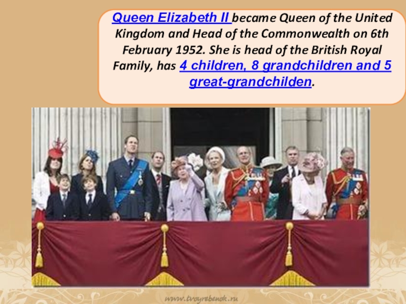 the Commonwealth on 6th February 1952. She is head of the British Royal Family, has 4 children, 8 grandchildren and 5 great-grandchilden.