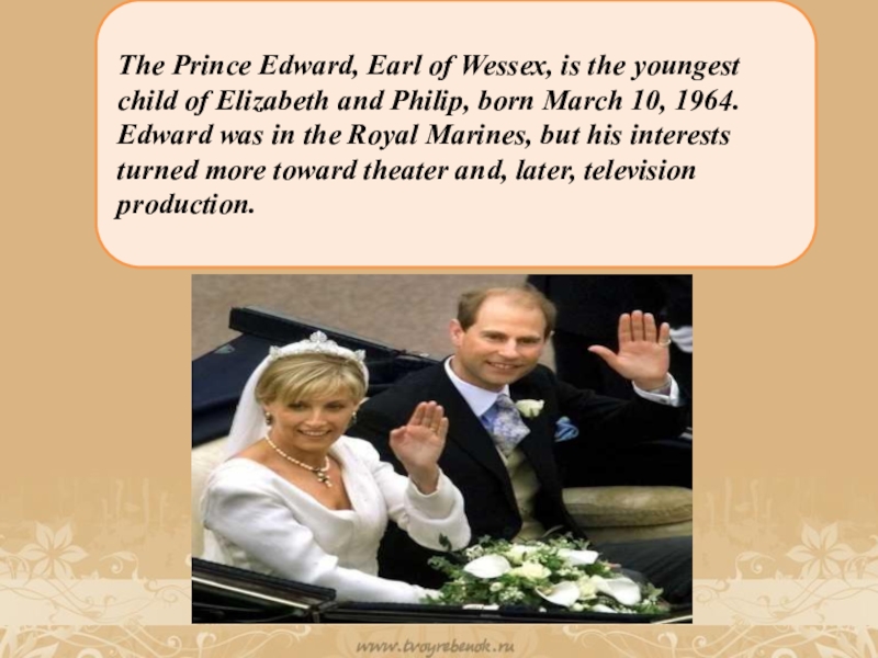 Elizabeth and Philip, born March 10, 1964. Edward was in the Royal Marines, but his interests turned more toward theater and, later, television production.