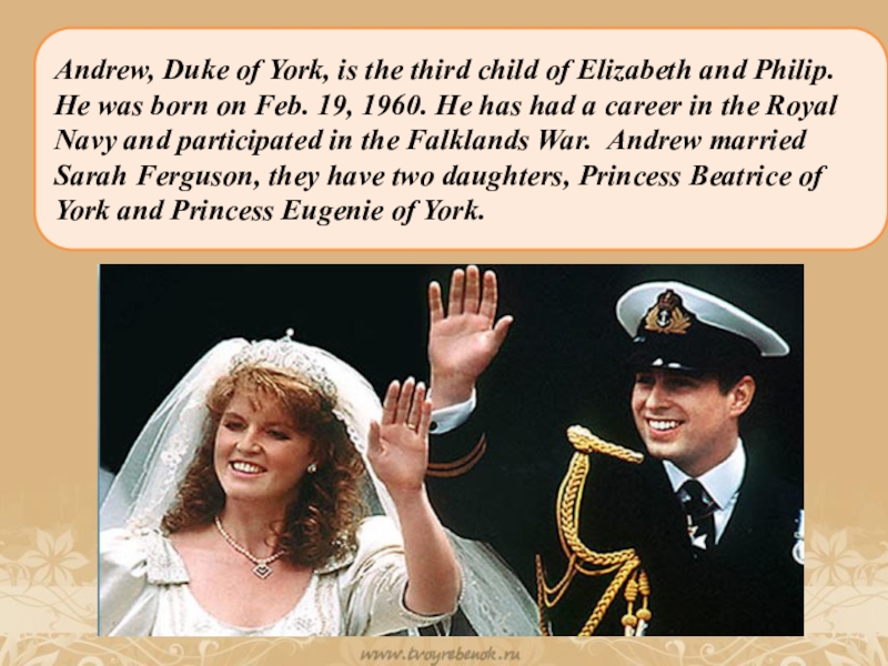 Philip. He was born on Feb. 19, 1960. He has had a career in the Royal Navy and participated in the Falklands War. Andrew married Sarah Ferguson, they have two daughters, Princess Beatrice of York and Princess Eugenie of York.