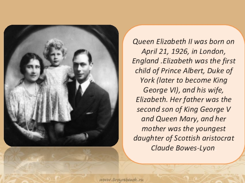 England .Elizabeth was the first child of Prince Albert, Duke of York (later to become King George VI), and his wife, Elizabeth. Her father was the second son of King George V and Queen Mary, and her mother was the youngest daughter of Scottish aristocrat Claude Bowes-Lyon.