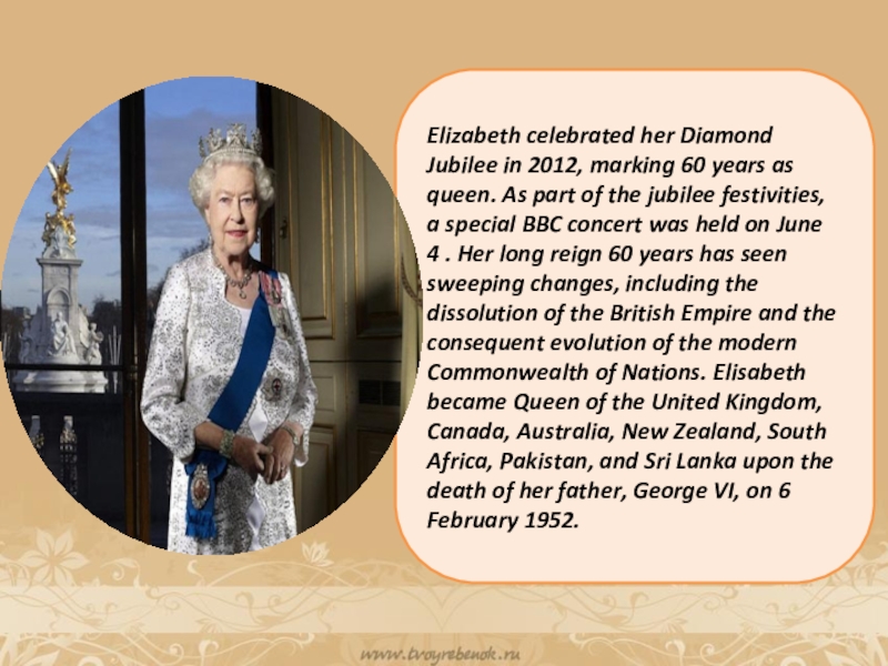 queen. As part of the jubilee festivities, a special BBC concert was held on June 4 . Her long reign 60 years has seen sweeping changes, including the dissolution of the British Empire and the consequent evolution of the modern Commonwealth of Nations. Elisabeth became Queen of the United Kingdom, Canada, Australia, New Zealand, South Africa, Pakistan, and Sri Lanka upon the death of her father, George VI, on 6 February 1952.