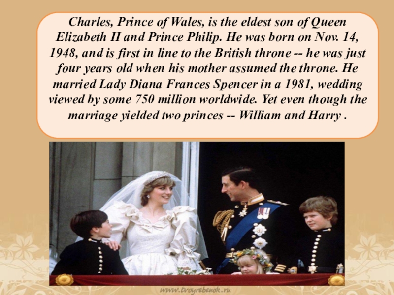 II and Prince Philip. He was born on Nov. 14, 1948, and is first in line to the British throne -- he was just four years old when his mother assumed the throne. He married Lady Diana Frances Spencer in a 1981, wedding viewed by some 750 million worldwide. Yet even though the marriage yielded two princes -- William and Harry .