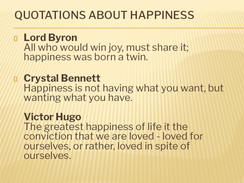 Quotations about happinessLord Byron All who would win joy, must share it; happiness was born a twin. Crystal Bennett Happiness is not having what you want, but wanting what you have. Victor Hugo The