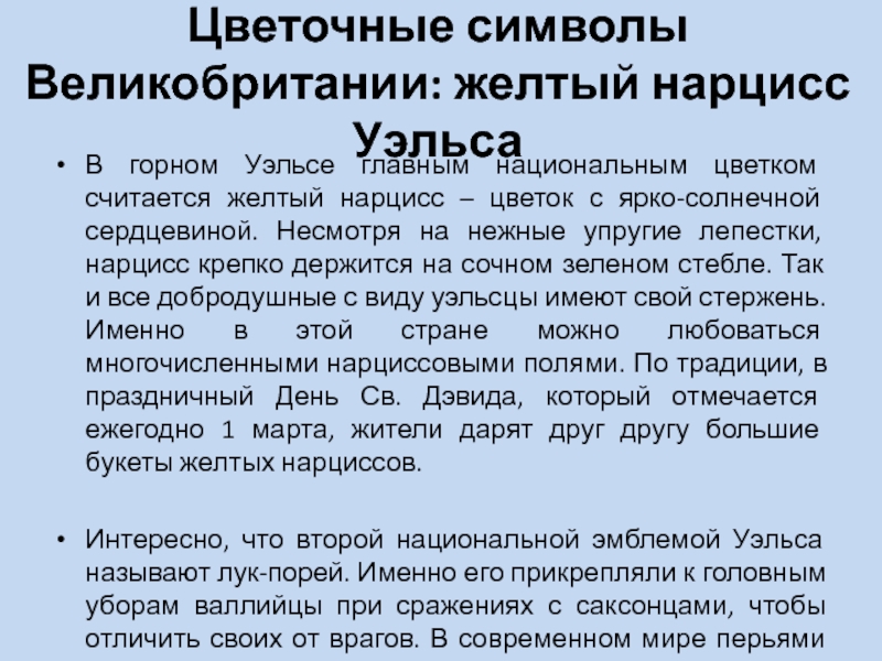 считается желтый нарцисс – цветок с ярко-солнечной сердцевиной. Несмотря на нежные упругие лепестки, нарцисс крепко держится на сочном зеленом стебле. Так и все добродушные с виду уэльсцы имеют свой стержень. Именно в этой стране можно любоваться многочисленными нарциссовыми полями. По традиции, в праздничный День Св. Дэвида, который отмечается ежегодно 1 марта, жители дарят друг другу большие букеты желтых нарциссов.