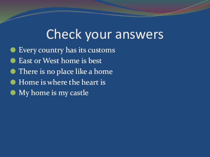 Check your answersEvery country has its customsEast or West home is bestThere is no place like a