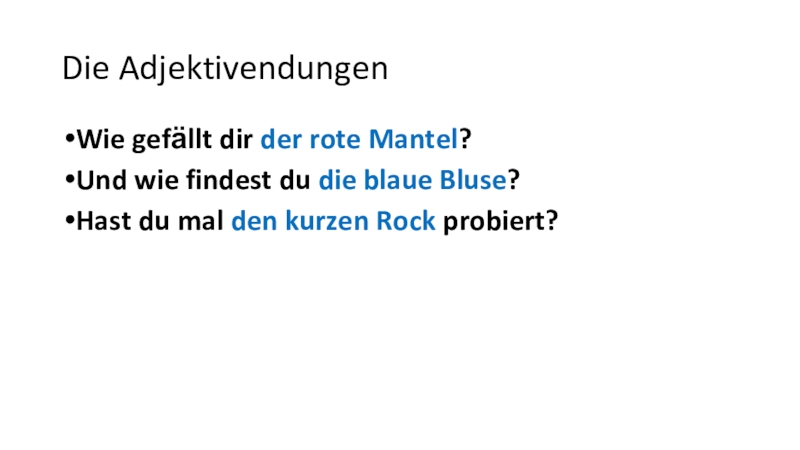 Die AdjektivendungenWie gefӓllt dir der rote Mantel?Und wie findest du die blaue Bluse?Hast du mal den kurzen